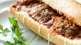 Sliced meatballs, signature meat sauce, mozzarella cheese, on a herb toasted bun.